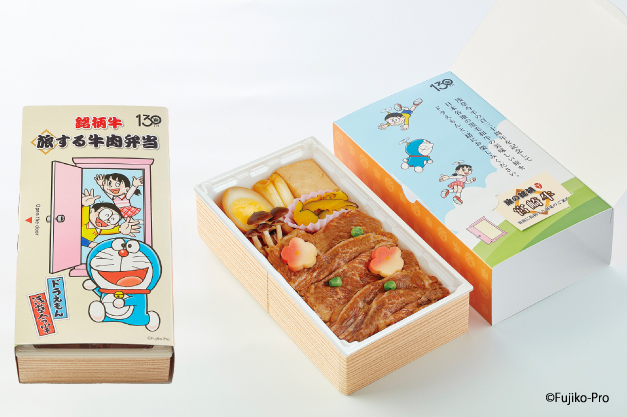 ドラえもんデザインパッケージの創業130周年記念商品「銘柄牛 旅する牛肉弁当」。2月1日(日)からは第10弾として「宮崎牛」を使用したお弁当が登場します。
